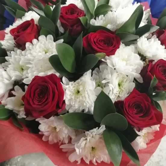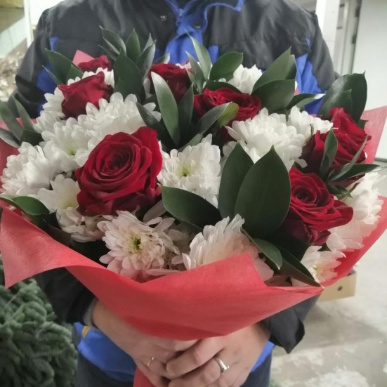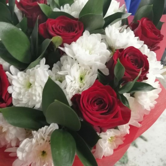 Букет «Бордовые розы и белые хризантемы»