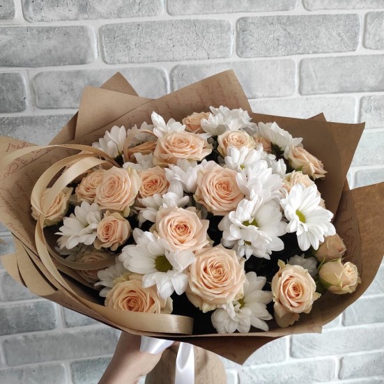 Букет «Белые хризантемы с розами»