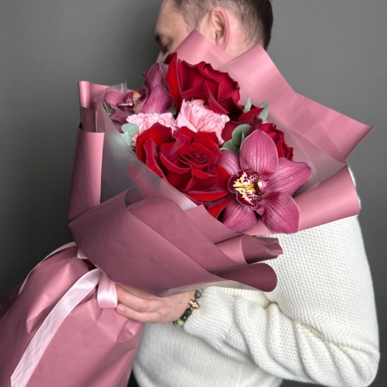 Букет из 3 красных роз, орхидей и диантуса