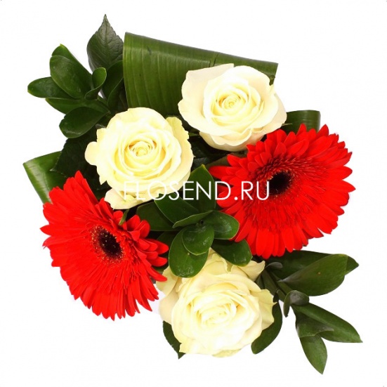 Букет «3 белых роз и 2 красных гербер»