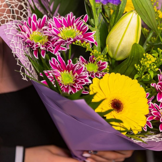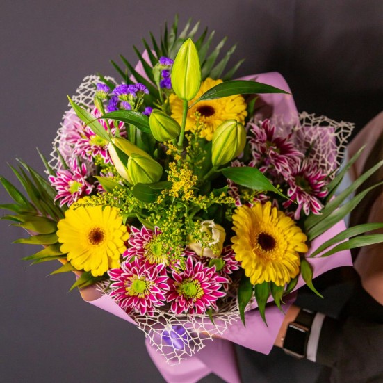Букет с розами, хризантемами, лилиями, герберами в Тутаеве