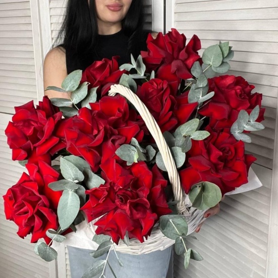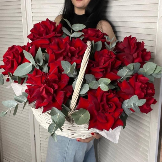 Корзина из 9 красных французских роз в Тутаеве